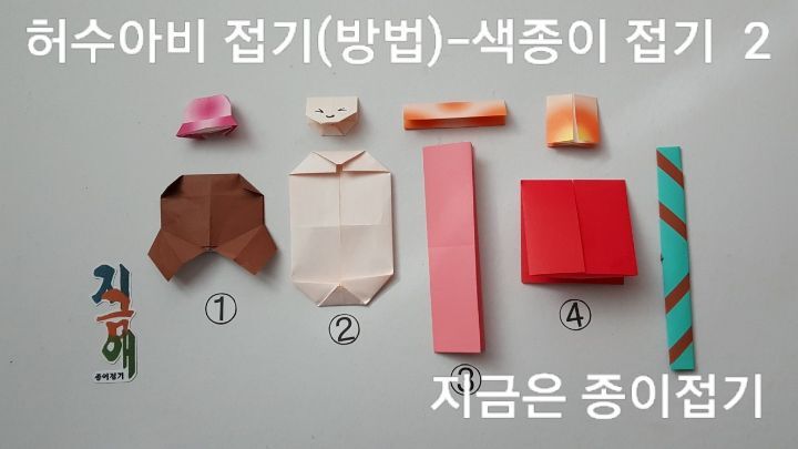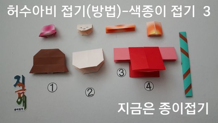 색종이로 허수아비 접기 2) ①모자 접기의 뒤쪽 모양입니다. ②양쪽을 세모로 마주 접은 후 모서리를 접어 줍니다. ③문접기 한 것을 긴 모양이 되도록 반 접었어요. ④문접기 한 것을 짧은 모양이 되도록 접었어요.