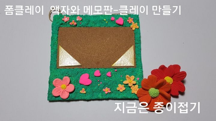 폼클레이로 바탕과 틀 부분을 덮어 주고 클레이로 작은 액자와 메모판에 꽃을 만들어 꾸밈 하였습니다.