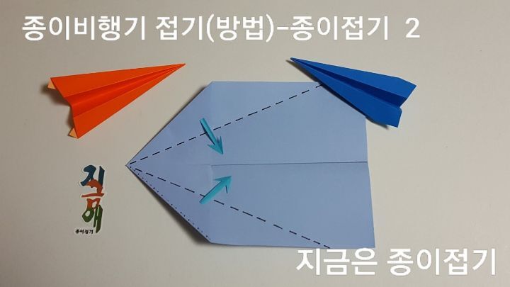 종이비행기 색종이 접기 2) 앞에서 접은 상태에서 그대로 ----- 점선을 중심선에 맞추어 또 한 번 접어 주세요.