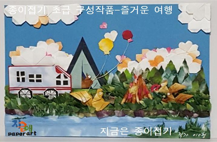 종이접기 자격증의 초급 과정을 마무리하며 만드는 종이접기 평면 구성입니다. 초급 지도서에 있는 접기 중에서 하나 이상을 포함하여 작품으로 만든 작품입니다.