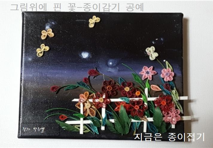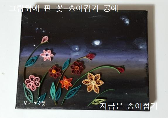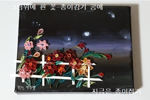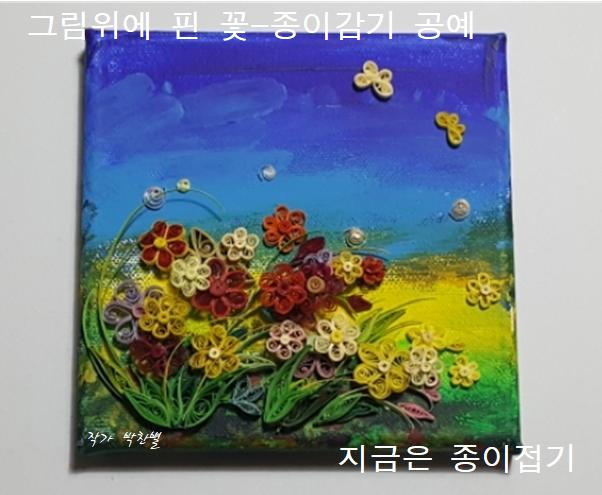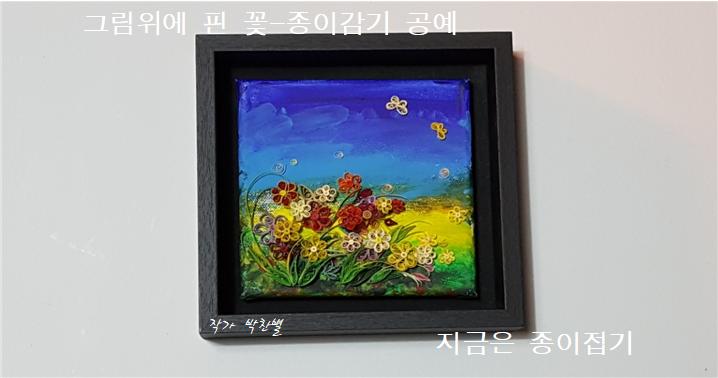 캔버스 그림 위에 종이감기 꽃이 피었습니다. 띠골판지 감기와 종이감기 띠지를 사용하여 만드는 기초과정을 마친 후 응용하여 만들고 캔버스 그림 위에 구성한 소액자 작품입니다.