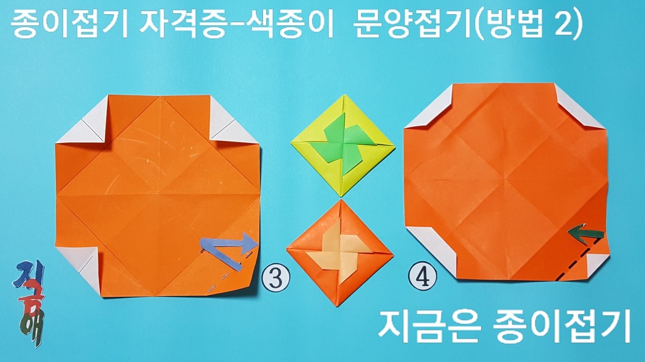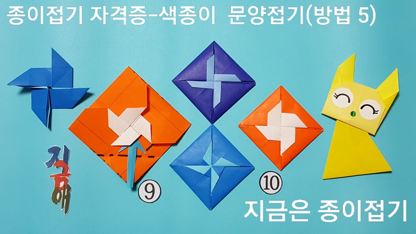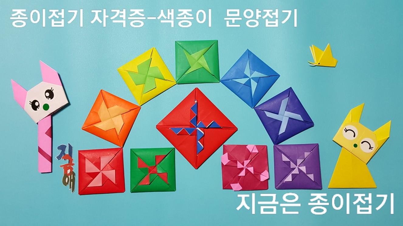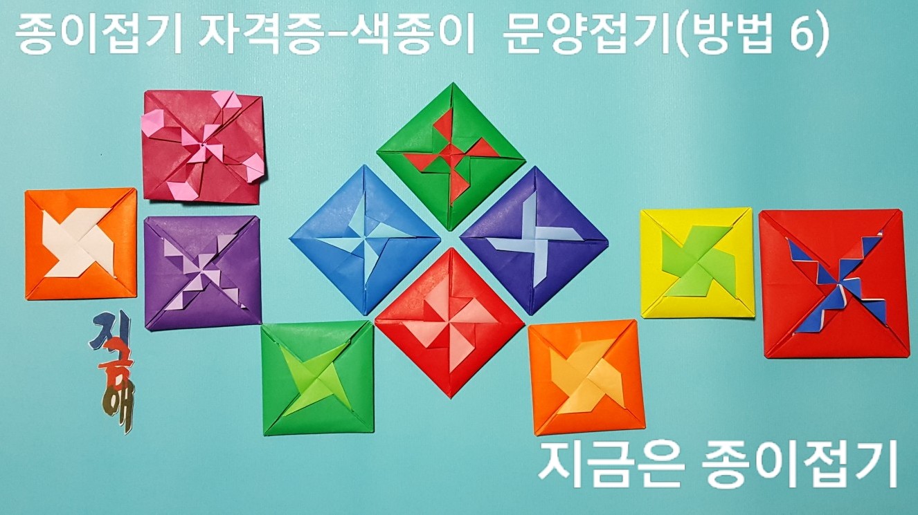 한국종이접기 협회의 종이접기 자격증 과정의 초급 단계에서 접어 볼 수 있는 문양 접기입니다. 딱지 접기처럼 보이는 중심에 무늬가 있으며 접기의 방법에 따라 여러 가지의 모양으로 만들 수 있습니다.
