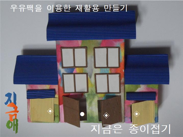 종이접기 시간에 어린이들의 방학숙제로 만들 때 함께 만든 것으로 우유팩을 사용하여 집 모양으로 만들고 비닐봉지를 수납할 수 있도록 하였어요. 어린이들이 종이접기와 더불어 만드는 즐거움을 갖고 할 수 있는 재활용 만들기입니다.