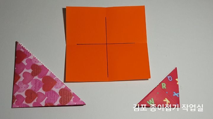 세모 두 번을 접은 후 중심에 맞추어 아래의 그림처럼 접을게요.