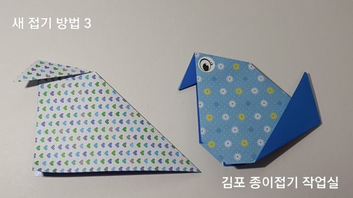 옆에 완성되어 앉아 있는 새의 모양을 보면서 접으면 더 쉬워져요.