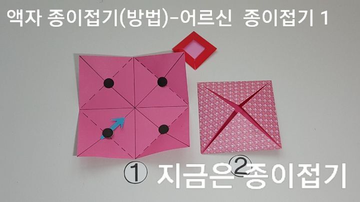 액자 종이접기 방법 1) ①세모 두 번과 네모 두 번을 접었다 편 후 ●의 점선을 화살표 방향으로