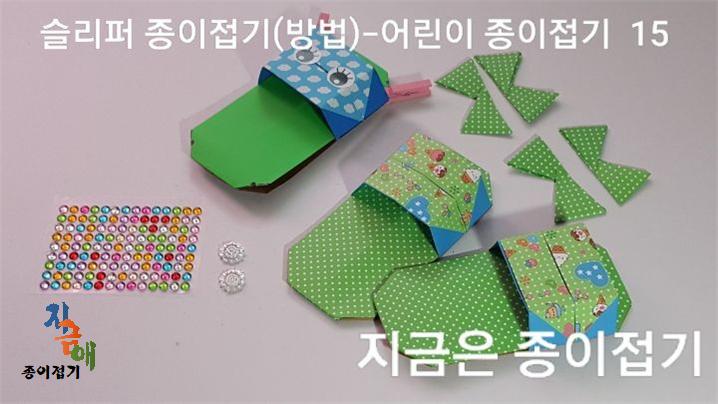 슬리퍼 종이접기 방법 15) 리본 접기를 하여 준비하고 반짝이는 예삐도 준비했어요.